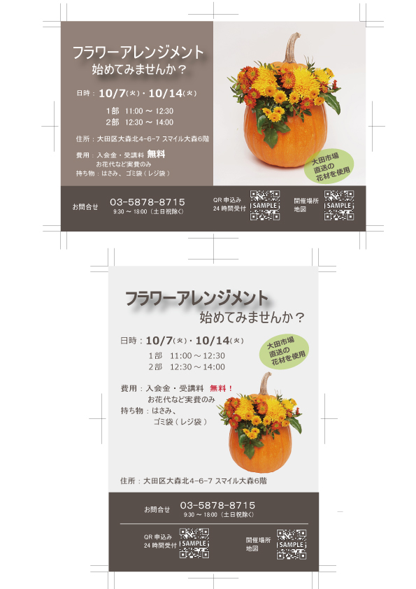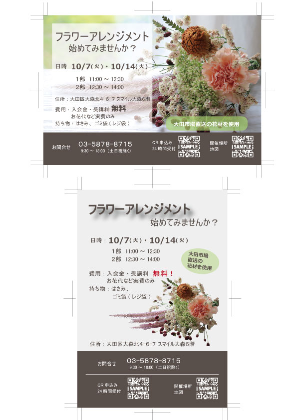 大田区の拠点施設スマイル大森6階に新規オープンするフラワーアレンジメント教室の告知DMをデザインしました。フラワーアレンジメント画像の作成(トリミング)をし、キャッチコピーやサービス内容、お問い合わせ先・申込方法を記載しました。
